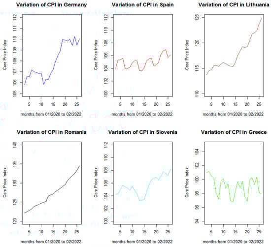 From the analysis of the graphs, it is easy to see, in the case of the Western European countries (Spain, Germany, Slovenia), a staggered overlap of the increase in consumer prices with the four pandemic waves, defined for the periods: March–June 2020 (corresponding to months 3–5 from the graphs), October–December 2020 (months 10–12), March–May 2021 (months 15–17), and September–November 2021 (months 21–22). In the case of Romania and Lithuania, the increase in prices is much more uniform, with a significant gap between May and October 2021. In the case of Greece, there is a small decrease in consumer prices superimposed over the four waves of COVID-19 restrictions. The economic impact of the COVID-19 pandemic was also shown in other articles, and our findings are consistent with previous results [23,24,25].
