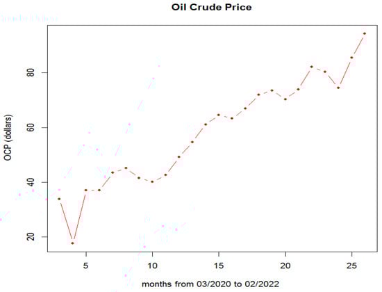 The original data for the OPEC crude Oil basket Price variation were retrieved from the Statista site [26], as shown in Figure 4. The first pandemic wave coincides with a strong reduction in oil demand, reflected by the significant decrease in the price of the oil barrel, followed by an accelerated increase in oil consumption and its price during the period of relaxation of traffic restrictions.
