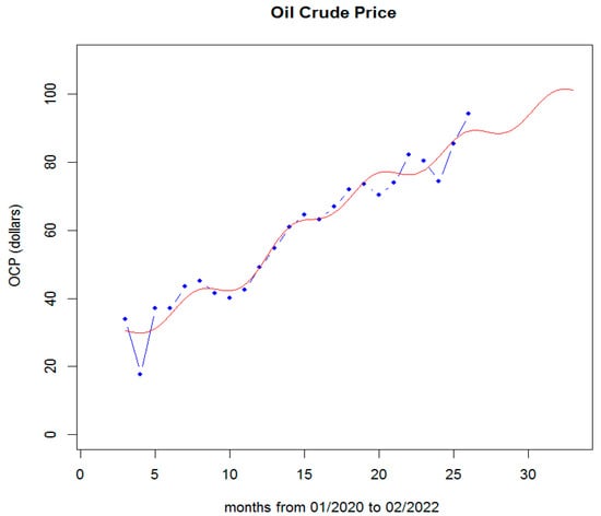 The Fisher test of the relevance of the model resulted in a Fstat = 172.2 > Fcritical = 2.6987 for 6, 17 degrees of freedom respectively. Therefore, the model passed the Fisher test of significance. The coefficients c3 and c6 pass the t-test (Student) of relevance with tvalue(c3) = 1.869 and tvalue(c6) = −2.106, respectively (both greater to tcritical = 1.739, for 17 degrees of freedom with significance level a = 0.05). In consequence, both the logistic terms grown and seasonal one can be considered relevant. In Figure 5, we represented the regression function for the period March 2020–October 2022; the model predicted a maximum Crude Oil Price of around 101.5 dollars in July–August 2022.