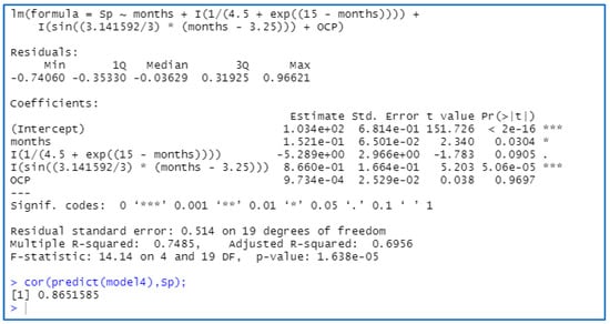 The estimation of the coefficients a0–a7 was performed in R code language (version R X64 4.0.3). First, the estimation of a3, a5, and a6 using the NLS package, after the estimation of the remaining coefficients using the Stat package. The method employed was the less square residual: the optimization of minimal average residuals. For example, we have presented in Figure 6 a screenshot of the results provided by the R tool. Each coefficient is first estimated by the least squares method, R also displaying the error of the estimate, the value of the t indicator for the student’s test to be revealed of each coefficient, the probability that this coefficient is ignored, the estimated values for R-square and Adjusted R-square indicator, as well as the results of the Fisher test on the significance of the model (given by the probability of the null hypothesis) at the end. The last line represents the correlation between the data predicted by the model for the CPI and the initial values.