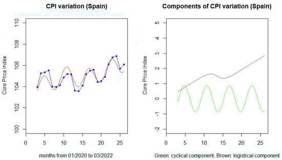 The regression model for the Core Price Index variation in Spain. In blue is represented the initial data, in red the regression model, in brown the logistical component of CPI variation, and in green the cyclical component of CPI variation induced by pandemic waves.