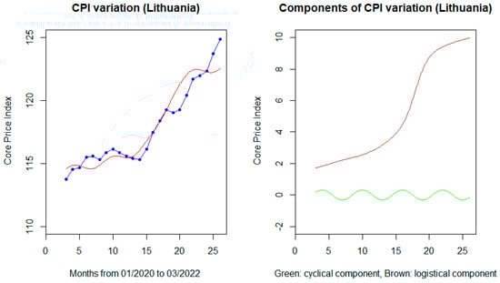 The regression model (7) for the Core Price Index variation in Lithuania. In blue is represented the initial data, in red the regression model, in brown the logistical component of CPI variation (including the oil price dependence), and in green the cyclical component of CPI variation induced by pandemic waves.