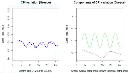 We represented separately the direct dependence of Consumer Price Index on cyclical pandemic waves (in green, in the right graph) and the dependence of CPI on global economic crisis as a logistical component (in brown). The model passes the Fisher test of significance (Fstatistic = 19.84 > F6,18 = 2.698).
