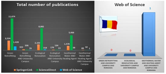 Researching the scientific literature to identify publication trends and research gaps is essential in this promising field for a future based on sustainable development. In this regard, the relevance of the topic chosen for the study was assessed by applying search algorithms in three large and scientifically validated databases (i.e., SpringerLink, ScienceDirect, and Web of Science). The results displayed in each database (Figure 1) underline the low number of publications that have addressed the concepts of green retrofitting, ecological renovation, and geothermal water as a heating agent; moreover, when using the Boolean operator AND, which filters and associates these concepts with university campuses, the results obtained are even more drastically reduced, reaching only one result displayed in a Web of Science search. Moreover, the whole working context applied to the situation in Romania shows a major deficit of publications evaluating university campuses in these integral parts of sustainable development, thus identifying certain knowledge gaps. In Romania, there is a significant gap in knowledge regarding the need for green retrofitting studies of old buildings on university campuses. The only resulting paper identified in the Web of Science for the application of geothermal water as a heating agent in university campuses in Romania belongs to a part of the authors’ collective [23], the use of geothermal water in renewable energy is an essential and rare aspect for a university campus in general (no paper in the world provided studies related to retrofitting buildings in a university campus, built in different years during more than a century, some of them changing their initial function, and heated with geothermal water), and even more so for a “green” one.