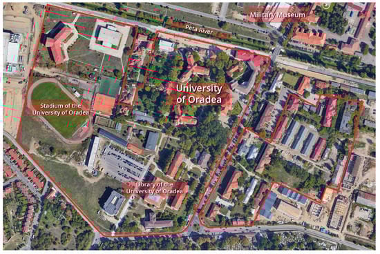 - University of Oradea. Satellite Image. Available online: https://latitude.to/articles-by-country/ro/romania/71587/university-of-oradea (accessed on 2 February 2023).