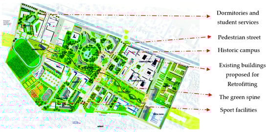 The project was developed by an architect with European experience in the design of university campuses, and it states that, “The concept starts from the idea of a green spine with the role of a connector along the entire length of the campus. This spine unites the historical part of the campus with the proposed new areas, giving the whole complex a unitary aspect from a compositional point of view. The proposed new functions relate to the existing ones through an integrated system of public and green spaces”. A figure from this Masterplan presents the approach to the project (Figure 4) [33].