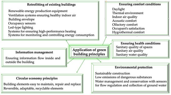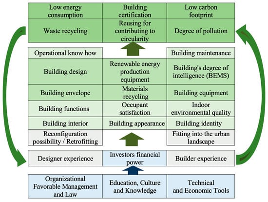- A summarizing scheme depicting the main aspects which help in the construction of a GB or in the transformation of an existing building into a sustainable building (Figure 13);