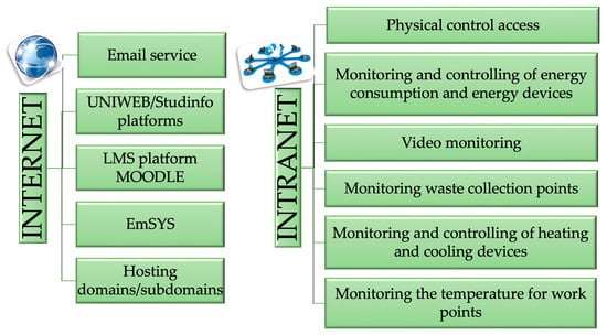 Data and communication are essential to the conduct of UO activities [35]. Hence, for efficient operation at the university level, an intranet and extranet communication solution is provided based on a wide range of latest generation technologies that ensure safe, high-speed access. The IT services offered in the context of UO (Figure 7) conditions offer both high quality and appropriate information/data security [36]. The solutions implemented by the IT department offer both a high level of security and confidentiality of information/data, constituting a true spine for the development of a real smart campus [34].