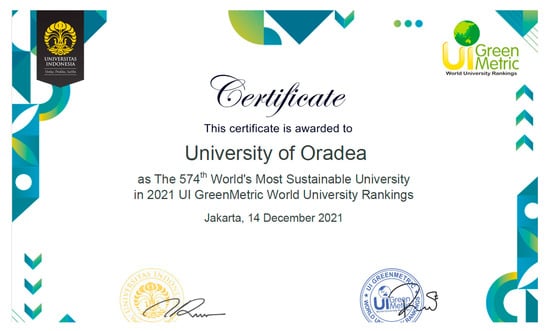 Climate change mitigation targets are set at international, European, and national levels. These are taken over in the development strategies of the territorial administrative units, in our case—in the development strategy of the UO. The present paper emphasizes that the defining elements, respectively the criteria for the certification of GB, settlements and further—of green university campuses are applicable and constitute an incentive for both beneficiaries and investors. By applying for certification in the UI Green Metric system [46,47], UO understood and directed its development strategy to meet the criteria of a “green” campus (Figure 15), to provide students and teachers with a healthy environment, to have a sustainable development, and to help combat climate change.