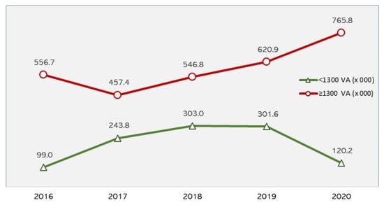 Indonesia ranks tenth in the world’s electricity consumption, and annually tends to increase. During the 2020 crisis, the demand of household consumers for upgrading to an installed power capacity of 1300 VA or higher showed an upward trend (Figure 1) compared to the lower capacities, resulting from growing dependency on electric equipment in daily life. Household electricity consumption continues to rise, particularly for living conveniences such as air conditioners (almost 10% used in Indonesia [9]), water pumps, lights, TVs, refrigerators, entertainment equipment, and other electronic equipment [10]. Meanwhile, the electricity reserve margin in the Java-Bali grid, including the 35 GW megaproject, reaches an average of 55.55% [11]. Although the electricity supply is sufficient to meet the increasing demand for electricity and there are more varied choices of electric kitchen appliances on the market, the trend of LPG consumption is continuing to increase (Appendix A, Figure A1). The problem is that people are less enthusiastic about the intention to switch from LPG to electric power, particularly for household cooking energy.
