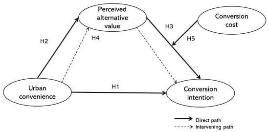 The study is novel in that it proposes a conversion intention framework via the integration of the theory of consumption value and the value-based adoption model, which involve two key factors that influence conversion intention: urban convenience developed from content analysis categories in time-oriented advertisements [36] and perceived alternative value (PAV) based on the theory of consumption values. Additionally, the research investigates the moderating effect of conversion costs on conversion intention (COIN) [32].
