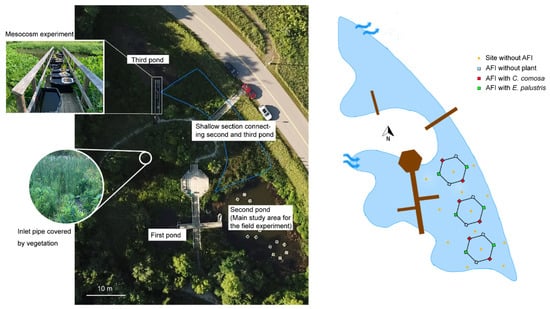 Most AFI research to date has largely been conducted in controlled experimental settings (microcosms/mesocosms) [13,14]. The advantage of microcosm/mesocosm studies is that they can control or isolate specific parameters of interest (i.e., concentration of nutrients, AFI coverage, and hydraulic retention time) to separate and understand the underlying mechanism(s) affecting the growth and development of AFI plants, as well as the performance of AFIs. However, while these lab-scale experiments have provided an extensive database of AFI performance in controlled conditions, they only present crude simplifications of the greater physical, biological, and chemical complexity of natural systems, particularly when conducted on small spatial and temporal scales [19]. On the other hand, examining the implementation of AFIs on a large scale provides insight into the overall quantity of nutrients that can be extracted from a body of water and helps to evaluate the feasibility of deploying AFIs for water quality improvement purposes. For instance, Olguín et al. (2017) conducted studies which revealed that a 33 m2 AFI was capable of removing up to 0.11 g/m2 TP per day, while Afzal et al. (2019) reported that AFIs could process 60 million m3 of wastewater annually at a cost of USD 0.00026 per m3 [16,20]. To enhance our limited mechanistic understanding and the predictive ability of AFIs as a sustainable solution for nutrient pollution, more long-term, field-scale AFI experiments are necessary. In an effort to address this limitation, our study combined field and mesocosm experiments to evaluate the nutrient-removal efficiency of AFI systems using two species of native aquatic plants, Carex comosa and Eleocharis palustris, in a constructed wetland system in north-central Ohio. These species have a wide range of ecological tolerance and are suited to the environmental conditions observed in our study site. They are widely used in landscaping, wetland restoration, and wastewater treatment purposes.