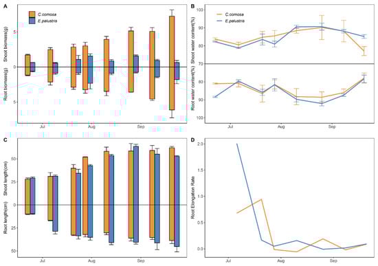 (A) Shoot and root dry biomass, (B) shoot and root water content, (C) shoot and root length, and (D) root elongation rate (RER) for C. comosa and E. palustris.