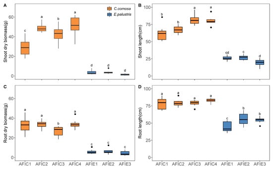 Growth conditions of C. comosa and E. palustris throughout the study period: (A) shoot dry biomass accumulation, (B) shoot length elongation, (C) root dry biomass accumulation, and (D) root length elongation. Means denoted by different letters above the box plots (a–d) indicate significant difference between treatments (p < 0.05) (Fisher’s least significant difference). AFICs indicate AFI units containing C. comosa at different locations in the second pond; AFIEs indicate AFI units containing E. palustris at different locations in the second pond.