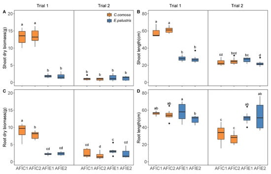 Growth conditions of C. comosa and E. palustris during the two trials (time periods) in the field experiments: (A) shoot dry biomass accumulation, (B) shoot length elongation, (C) root dry biomass accumulation, and (D) root length elongation. Means denoted by different letters above the box plots (a–d) indicate significant difference between treatments (p < 0.05) (Fisher’s least significant difference). AFICs represent AFIs containing C. comosa at different locations in the second pond; AFIEs represent AFIs containing E. palustris at different locations in the second pond.