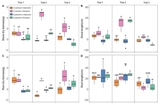 Growth conditions of C. comosa and E. palustris during the three trials (time periods) in the mesocosm and the first pond. (A) Shoot dry biomass accumulation, (B) shoot length elongation, (C) root dry biomass accumulation, and (D) root length elongation. Means denoted by different letters above the box plots (a–f) indicate significant difference between treatments (p < 0.05) (Fisher’s least significant difference).