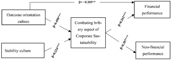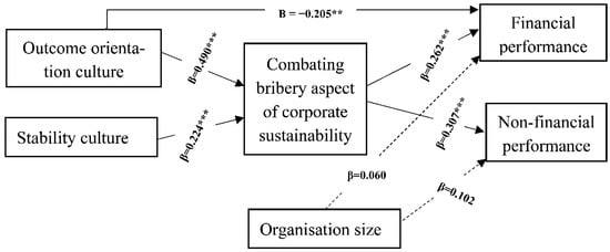 The SEM results reported in Figure 2 and Table 3 (Model B) reveal that the outcome-oriented culture is significantly and positively associated with the bribery combating aspect of corporate sustainability (β = 0.490; p = 0.000). Hence, hypothesis H1 is supported. The findings indicate that the culture of promoting competitiveness among employees, responding to their high expectations of performance, as well as providing them rewards based on their individual performance may refrain them to take bribes from and/or offer bribes to business partners. Hence, organisations that want to combat bribery practices, and thus promote corporate sustainability practices, are suggested to pay attention to develop an outcome-oriented culture by developing a culture of respecting employees’ high expectations of performance, providing them rewards based on performance, and motivating them to be action-oriented. Our findings are in line with what other researchers discourse about the role of organisational outcome orientation culture on corporate sustainability practices [41,42]. Researchers [48,56] argue that the existence of outcome orientation culture is likely to promote employee sustainability practices. Our empirical findings contribute to the existing sustainability literature, with insights into the role of suitable organisation culture towards enhancing sustainability practices.
