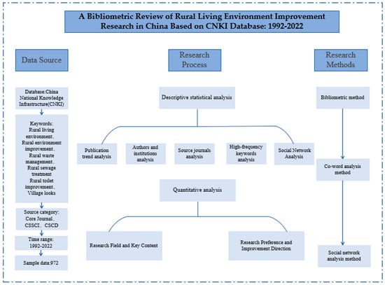 Bibliometrics can quantitatively analyze the external characteristics of a large body of literature, to identify the research status, knowledge structure, development trends, and research frontiers of a field []. This study used bibliometrics to analyze the sample literature on rural living environment improvement in China. It also utilized tools to display the research results visually. Figure 1 shows the data collection and research process of this paper.