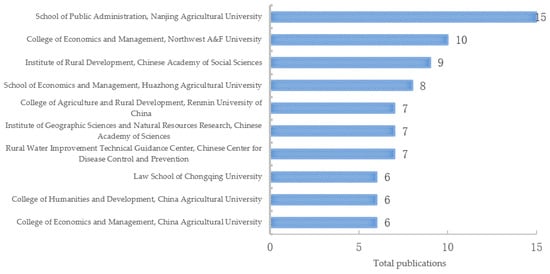After sorting and ranking the number of published papers of all research institutions, it was found that the highest number of publications from a single research institution was 15 (Table 3). After calculation, . This means that institutions with more than two publications are core research institutions. Among the 614 research institutions, there are 40 core research institutions, with a total of 196 published papers. The core research institution that issued the most papers was the School of Public Administration of Nanjing Agricultural University, which focused on applying the Public Private Partnership (PPP) model, farmers’ participation, and introducing social capital in rural environmental government. In addition, the College of Economics and Management of Northwest A&F University, the Institute of Rural Development of Chinese Academy of Social Sciences, the School of Economics and Management of Huazhong Agricultural University, and the College of Agriculture and Rural Development of the Renmin University of China also had a high degree of activity.