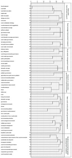 - Field 4: Research on collaborative governance of the rural environment. This includes nine keywords: pollution governance, agricultural non-point source pollution, rural environmental pollution, collaborative governance, rural environment, comprehensive improvement, countermeasure, issue, and status quo. Collaborative governance is a new idea and direction of rural environmental governance. In the report of the 19th National Congress of the Communist Party of China, it was pointed out that we should, “build a social governance pattern of common construction and shared governance”. Currently, the main reason for many problems in the rural ecological environment is the need for more responsibility from the government, enterprises, farmers, NGOs, and other relevant bodies. This has led to the fragmentation of collaborative governance functions, disorderly ways, and single subjects. To fully implement the strategy of rural revitalization and promote the thorough improvement of the rural living environment, it is necessary to realize the multi-governance and collaborative governance of stakeholders, and give full play to the unique advantages of different responsible subjects. (i) It is necessary to strengthen supervision, to improve the government’s governance capacity. The government is an essential leader in the collaborative governance of the rural environment, which influences the formulation of policies, the participation of subjects, the investment of human and material resources, and the supervision of power in the collaborative governance process []. (ii) Incentives should be emphasized, to enhance the motivation of enterprises and social organizations. Enterprises and social organizations guarantee cooperative environmental governance in rural areas. The combination of material and spiritual incentives can be adapted, to actively promote enterprises and social organizations to participate in rural environmental collaborative governance. (iii) To ensure villagers play the leading role. Villagers are essential subjects of collaborative environmental governance in rural areas. Strengthen the publicity and education of environmental management, so that the people understand the concept of “ecological benefits are economic benefits”. Play the role of the main body to promote collaborative governance.