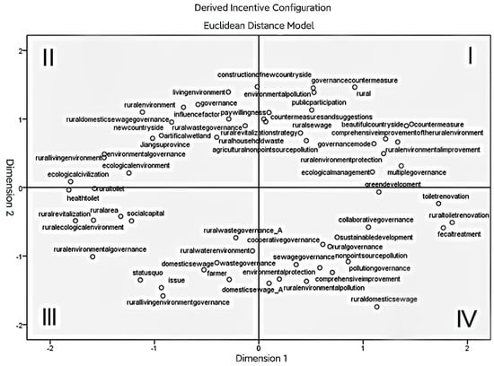 Cluster analysis helps us to identify the main areas of the study of rural living environment improvement in China. It can be seen, that the research of Chinese scholars mainly focuses on rural toilet improvement, rural waste management, rural sewage improvement, collaborative governance of the rural environment, new rural construction and governance, and rural environment green development. The research scope is wide and covers all aspects of rural living environment remediation. However, the heat of research varies from field to field. We can further explore the research preferences of scholars with the help of multidimensional scaling analysis. It is helpful for us to sum up the directions of future research.