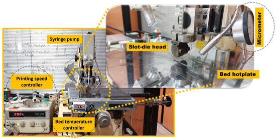 In-house assembled slot-die machine equipped with slot-die head, micrometer, bed temperature controller, printing speed controller, syringe pump, and bed hotplate motorized X-Y table.