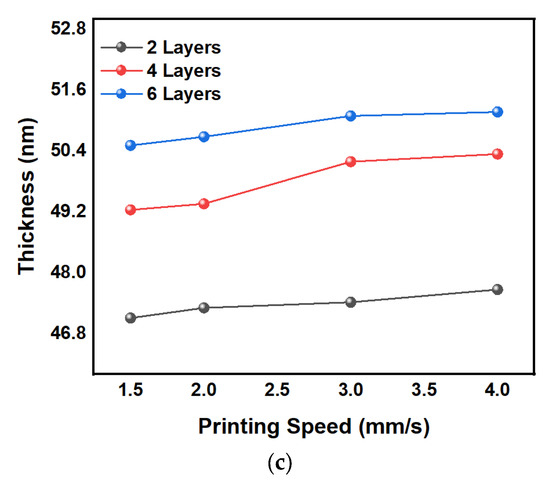In the first step, the effect of the temperature on the block layer morphology was assessed. TiO2 block solution was printed at room temperature of 20 °C and a slightly higher temperature of 25 °C. The printing parameters for the printing blocking layer are indicated in Table 1. A temperature slightly higher than room temperature was chosen to form a layer with a more suitable morphology. The layer formed at higher temperatures was expected to prevent moisture condensation during deposition [40]. However, as shown by the AFM microscope images in Figure 2a,b, increasing the deposition temperature increased surface roughness from 16 nm to 23 nm at 20 °C and 25°C, respectively. Therefore, room temperature was used to deposition the TiO2 blocking layer for the next set of fabricated solar cells. To achieve the same thickness as that obtained in the spin-coated layer (approximately 50 nm, as shown in Figure S3), different deposition steps (two layers, four layers, and six layers) and printing speeds (1 mm/s, 2 mm/s, 3 mm/s, and 4 mm/s) were tested. As indicated in Figure 2c, the thickness of the block layer changed from 47 to 51 nm by varying printing speeds and deposition steps. Based on the results, the optimum thickness was obtained at 3 mm/s for printing four layers of block solution. It should be noted that, in this step, the block solution was used in the same concentration as the spin-coated layer. If block solution engineering is undertaken, the desired thickness can be achieved with reduced layer printing. Transmittance data for the printed layers can be seen in Figure S3.