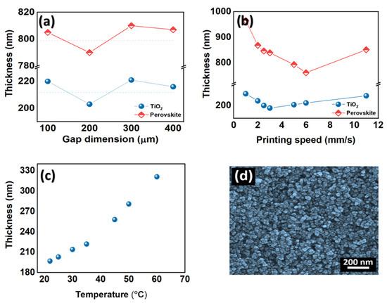 (a) Gap distance between the printing head and substrate vs. layered thickness and (b) printing speed vs. layered thickness of mp-TiO2 and perovskite thin films. There are two measures of thickness attitude vs. speed: evaporation and the Landau–Levich regime. (c) Dependence of thickness of mp-TiO2 layer on printing temperature. (d) Scanning electron microscopy image of mp-TiO2 utilizing slot-die printing method.