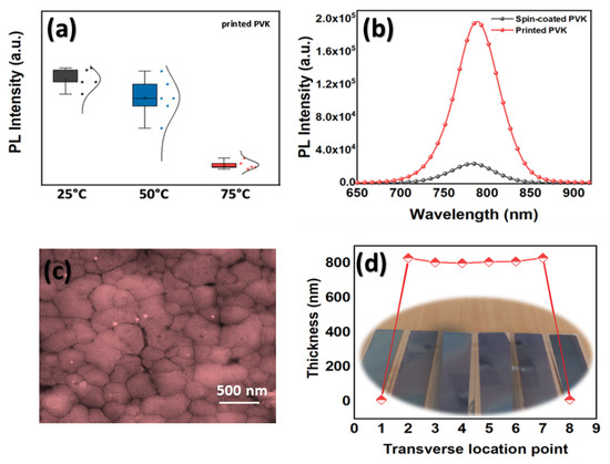 (a) Statistical data of printed perovskite film’s PL peak intensity at different substrate temperatures. (b) PL spectra of spin-coated and printed film. (c) Top-view FESEM image of printed perovskite film. (d) Perovskite film transverse thickness profile. The thicknesses were calculated from eight different points across the printed film thickness from absorbance data.