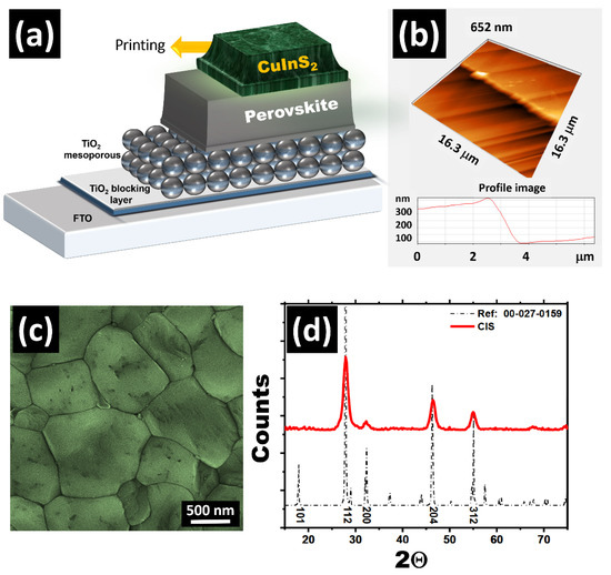 Figure 5a illustrates the printing schematics of CIS layer and its features. The thickness of around 250 nm was measured through AFM (Figure 5b). The top-view SEM image (Figure 5c) and the correspondence XRD illustrate the formation of CIS layer (Figure 5d). As it is evident, the crystalline CIS layer formed and the peaks are consistent with reference number 00-027-0159.