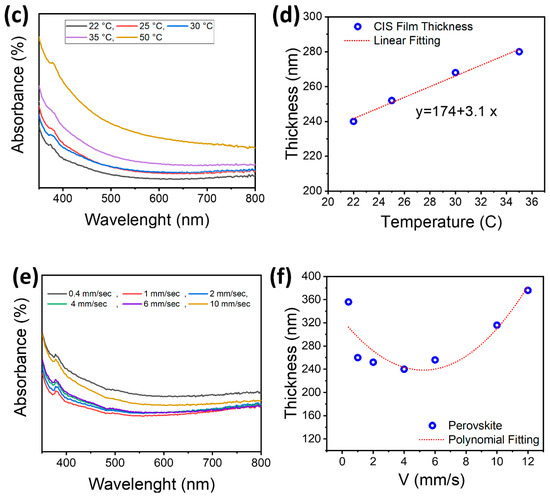 Relationship between absorbance (a,c,e) and thickness of CIS films (b,d,f) for various gap distances between the printing head and substrate (a,b), printing temperature (c,d), and printing speed (e,f). The film thickness as a function of deposition speed has two behaviors known as evaporation and the Landau–Levich regime. In the references, the slope of these two behaviors is identified. In this experiment, as we are working in a small area some deviations are seen that could be more seen in the evaporation part. The change of behavior in film thickness could be seen obviously.