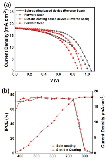Photovoltaic characterization (a) Current density–voltage measurement and (b) IPCE of spin-coated and slot-die coated perovskite solar cell.