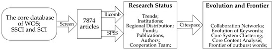 CiteSpaceV5.8R3 visual analysis tool and BicombV2.04 and SPSSV20.0 text analysis software are used to carry out visual research in the literary journals of digital economy research. The knowledge graph method can visualize the development process, evolutionary logic, and the internal research mechanism in a particular field, and then uncover its development law and vein [24,25]. CiteSpace is a popular bibliometric analysis tool that combines citation and co-citation analysis [26,27], and Bicomb adopts the current mature and popular database language development. It can quickly read bibliographic information in a literature database, and it accurately extracts fields, classifies, stores, and creates statistics. In addition, it can generate the co-occurrence matrix of bibliographic data, so as to provide comprehensive, accurate, and authoritative basic data for further research. By integrating the three analysis tools and taking the characteristics of the literature system and bibliometrics as the research object, these Both CiteSpace and Bicomb can not only quantitatively measure the contour distribution and the relationship and cluster among objects, but also describe and predict the development of specific research fields, analyze different countries, institutions, journals and scholars, compare their contributions, and creatively combine citation analysis and co-citation analysis, making the research more scientific and intuitive. First, the research status of the digital economy is sorted out holistically, and the development context is obtained. Then, using keyword clustering, evolution graph analysis, and emergent word detection, as well as other methods, an analysis of the international digital economy research trends, core systems, and hot evolutionary paths was performed to determine the digital economy research frontier trends and development trends. The main steps are as follows: