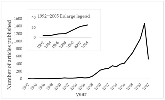 According to the preliminary statistical results of Bicomb and SPSS, the publication trend in the international research field is drawn in Figure 2, and the overall development shows an inverted L-shaped trend. The term “digital economy” first appeared in a journal paper in 1992, which originated from the development of electronic communication technology and related hardware in the 1990s, which established the technical basis for the digital economy. The changing trend can be broken down into three distinct phases. The embryonic stage, spanning from 1992 to 2000, was characterized by a scarcity of literature, a limited number of notable literary achievements, and sluggish growth, with an annual publication rate of less than 20. The subsequent stage, running from 2001 to 2015, marked a period of stable growth, despite occasional dips, resulting in an overall increase in the number of publications. The third phase, from 2016 to 2021, was a time of rapid expansion, with publications multiplying at an exponential rate compared to the preceding stage. This phenomenon can be linked to the global consensus reached at the G20 Hangzhou Summit in 2016, which emphasized the importance of the digital economy and led to its inclusion in the development strategies of various nations. The steady growth of international journals devoted to the digital economy, which totaled 7874 publications with an average annual rate of 263, demonstrates the sustained interest of the global academic community in this subject.