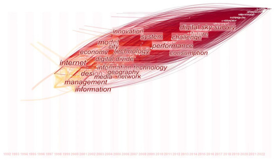 CiteSpace’s cluster analysis revealed that the LLR algorithm outperformed LSI, LLR, and MI in generating results that accurately reflect the actual situation. Consequently, the Log-likelihood rate (LLR), which is more significant in the evolution of subjects in the research field of digital economy [32], is the algorithm utilized in this grouping. The co-occurrence keyword clustering map is shown in Figure 5. The study period covered 1992–2022, with a slice size of one year, resulting in 84 clusters. To increase focus and exclude clusters with less obvious effects, seven modules were obtained by sequential screening based on clustering scale. Furthermore, the Modularity Q value of 0.4056, which exceeds the critical value of 0.4, indicates that the network modules in the clustering results are closely correlated, and the clustering structure is significant. The Mean Silhouette value of 0.7528, exceeding the critical value of 0.7, confirms that the clustering modules are highly related to the “digital economy” research subjects, lending credibility to the clustering result. The international hotspots cover a broad range, with a prominent thematic nature of technology.