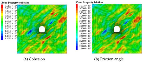 With the rapid improvement of engineering construction in China, along with the rapid development of ground space resources and the swift completion of infrastructure and transport, the ground space resources in flat areas suitable for construction are gradually being used up. In order to ensure the high quality of life of the people and to continue the rapid development of society and the economy, seeking new space resources and utilizing underground spaces while developing water resources, such as sea, lakes and rivers, especially the massive development of deep underground space resources, is an inevitable trend [1,2]. Geological material, with typical non-homogeneous properties, makes up the surrounding rock body of a tunnel or subterranean chamber. However, in the conventional study of geotechnical engineering, the rock is typically taken to be a continuous medium with homogenous qualities. The randomness and spatial variability of the mechanical characteristics of the real engineering rock cannot be taken into account by this abridged method. Engineers sometimes find it difficult to adequately foresee possible risks in subterranean engineering during the design stage because of a lack of a thorough grasp of the spatial heterogeneity of geological rock materials. The stability analysis of subterranean cavern engineering therefore places tremendous importance on how to properly study and evaluate the unpredictability of rock characteristics [3,4,5,6,7].