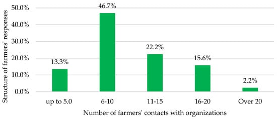 10]. Relations with these organizations were declared by just over a quarter of the respondents. In this way, contacts with organizations from this sphere were ranked third. Fruit growers are probably more aware of the fact that it is professional organizations and their self-organization that make their farms more efficient and effective.