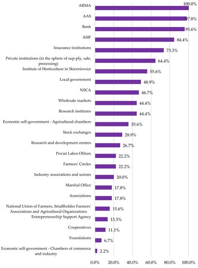 In turn, the institutional environment was defined as a set of institutions supporting market processes. It allows for the presentation of connections, expectations, and aspirations of agricultural producers for their proper functioning and further development. The institutional environment consists of all institutions that externally surround a farm and help it develop and improve its economic situation, e.g., by supporting the acquisition of EU funds, the sale of products, or the acquisition of new outlets for manufactured products [