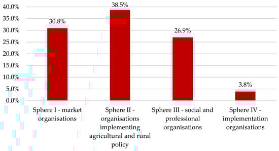 Taking into account the scope of activities of organizations operating in the vicinity of fruit farms, they were divided into four spheres: sphere I, market organizations; sphere II, agricultural and rural policy organizations; sphere III, social and professional organizations; and sphere IV, implementation organizations. The research shows that organizations implementing agricultural policies related to rural areas were important organizations for the fruit growers surveyed. These organizations operated in consulting, administration, management of land resources, natural environment, and spatial management. They included ARMA, NSCA, AAS, ASIF, local and economic self-government, and research institutes. Here, 38.5% of the respondents maintained contact with them (