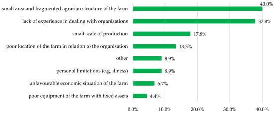 The research also addressed the issue of barriers to cooperation with organizations. Their sources could have considered the farm as well as institutional environment. They were thus divided into internal and external. Limitations considering farmers and farms very often result from the psychosocial characteristics of agricultural producers (e.g., age and education) and the economic situation (e.g., production size and income) and organizational structure of farms. The source of barriers in the institutional environment may be the lack of a coherent institutional base, i.e., norms and rules, organization, and mechanisms [