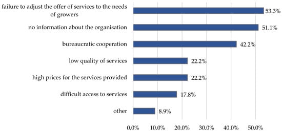 Figure 6), was the failure to adjust the offer of services to the needs of farmers (53.3%) or the lack of sufficient information about the functioning organizations and the area of their operation (51.1%). The fourth hypothesis (H4) was, thus, positively verified.