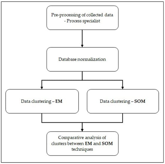 The collected database was submitted to EM and SOM clustering techniques in order to identify scenarios without any preliminary dealings, with the exception of the elimination of outliers. WEKA software [] version 3.8.6 × 64 was used to process the 29,292 records and 7 attributes related to the process parameters of the WTP under study. The automatic cluster generation option was enabled for this processing, and the heap size increased to 16,394 MB. The study was completed in four parts, as shown in Figure 2 and explained below.