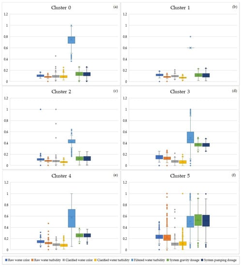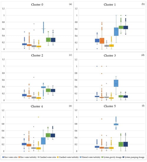 Table 7 shows the minimum, maximum, first and third quartile values, mean, median, and interquartile range of the parameters of each cluster resulting from the application of the SOM technique. By observing Figure 4a–f and Table 7, it is verified that clusters 0, 1, 3, and 4 are appropriate to be selected for training intelligent models for predicting coagulant dosage based on historical water treatment process. As with the EM technique, the exclusion of outliers from these clusters were also mandatory.
