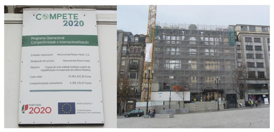 Without questioning the strict legal possibility, the use of public funds (from the European Union) in hotels is, of course, debatable. Moreover, in some cases, it is controversial what some posters from the EU-funded programs NOVO NORTE and COMPETE 2020 claim, for example, those posted during the construction of the Hotel Congregados, whose co-funding is based on the “requalification of a hotel unit”. In the case of Hotel A Brazileira, its goal would be to “strengthen the competitiveness of small and medium-sized companies”. Regarding the funding of the Hotel Monumental Palace, such is justified by the “creation of a hotel unit from the rehabilitation and recovery of an historical building” (Figure 3).