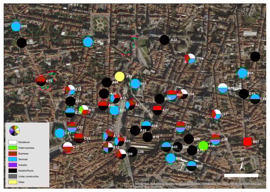 After 2010 (see Figure 5 and Figure 6), a significant number of buildings in ruin or mixed—“ruin/services” and “ruin/services/commerce”—became hotel units (Figure 6), with much more being partially transformed. On the ground floor, we could observe a considerable replacement in shop ownership and the significant addition of bars and restaurants as well as tourist-oriented retail.