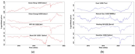 Figure 2. The related variables studied between 3 January 2019 and 26 February 2021. (a) The logarithmic prices among green bond, clean energy, WTI oil, and Brent oil; (b) The logarithmic prices of another fossil fuels.