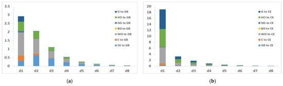 Finally, our results suggested that compared with Brent, WTI has a stronger relationship with GBs and CE (Figure 5b). Meanwhile, the volatility spillover of WTI to the GBs and CE markets is higher than that of Brent in the short-, medium-, and long-term horizons, while the volatility among them is higher in the short term, gradually decreases in the medium term, and disappears in the long term (Table 6, Table 7 and Table 8). A possible reason for this difference between WTI and Brent is that WTI is the U.S. crude oil price while Brent crude oil is a benchmark price for the European crude oil market (Aruga, 2015 [38]). Hence, the U.S. GB and CE prices are more likely to be connected to the WTI price. The result implies that in holding GBs and CE as a portfolio, investors need to pay more attention to the volatility spillover of WTI to manage risks. These results are somewhat different from those of Lee et al. (2021) [23], who indicated that the international Brent has a significant bi-directional causality from the global GB index.