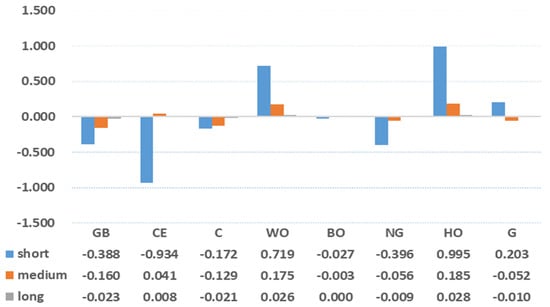 We also find that the volatility spillover among the GB, CE, and fossil fuel markets presents the strongest in the short term but gradually weakens from the medium term to the long term. Moreover, GBs are net volatility receivers from the WTI market and its related markets (HO and gasoline) in the long- and medium-term (Figure 8), indicating that investors holding GB assets should pay attention to the effects of WTI price volatility. This is because the crude oil market is susceptible to price volatility resulting from the effect of political and climatic factors (Lee et al., 2021 [23]); when the WTI price falls, investors might buy less risky GB to mitigate losses, thus facilitating the volatility spillover of WTI prices to the GB markets. This result implies that if GBs, CE, and crude oil are invested as a portfolio, the source of risk for the portfolio is mainly the volatility of WTI prices.