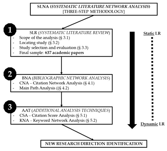 Despite the importance of this area of study, only few studies have examined it extensively and methodically, and their findings have led to disputed conclusions [3,31,72]. The SLNA was created in this context to explain earlier contributions on this topic and to gather evidence of new developments. This technique combines an SLR with a BNA. The SLNA was also coupled with other methods, such as citation score and index analysis, keyword analysis, and burst detection [21].