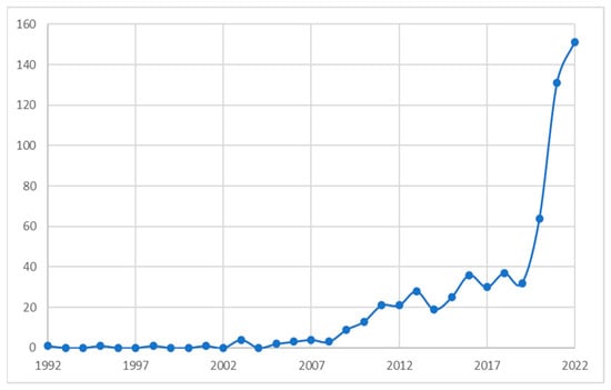 Distribution of 624 scientific studies published in the 1992–2022 time span.